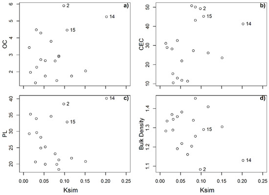 Clay is also behind the next set of variables to be discussed, but these also possess compound information from organic matter, mineralogy (e.g., specific surface) and porosity in general. The latter made the soil water retention, more specifically at higher potentials, show the strongest correlation against erodibility. Particularly, the correlation coefficient between the volumetric water content at 1500 kPa (θv-1500 kPa) and erodibility was r = −0.75. The reduction in uncertainty can also be observed in the scatter plot (Figure 6f), where a clearer (compared to clay vs. Ksim) inverse and nonlinear relationship between both variables is appreciated. The erodibility of soils 2, 14, and 15 align in a linear and positive dependency with θv-1500 kPa.