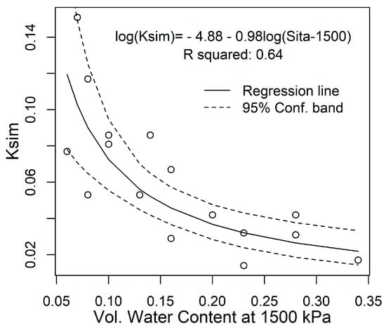 Figure 7 presents a scatter plot and the best fitted model between Ksim and θv-1500 kPa for the cluster of 16 soils containing non-swelling clays. Similarly to the findings of Voznesensky and Artsruui [41], the water retention characteristic was identified as a crucial variable in predicting soil erodibility and erosion rates. Observing the plot, one can discern the nonlinear and inverse relationship between Ksim and θv-1500 kPa. The optimal fit was achieved with a logarithmic (Euler base) model, which is depicted in Figure 7, with model parameters detailed in Table 4. This fitted model accounts for 64% of the variability in soil erodibility, with an RMSE of 0.02 erodibility units.