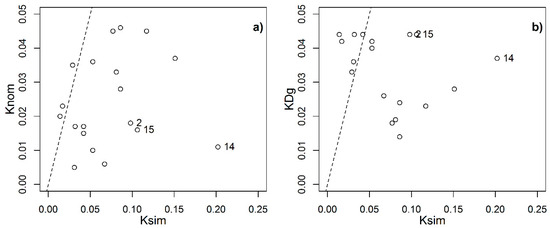 Figure 8 presents a plot of the measured erodibility (Ksim) against the estimated erodibility using (a) the nomograph (Knom) and (b) the geometric mean particle diameter (KDg) function. Examining both scatter plots, excluding soils 2, 14, and 15, it is evident that the nomograph reflected more accurately the trend of soil erodibility compared to KDg. The ranked correlation coefficient, RMSE, and concordance correlation coefficient between Ksim and Knom were 0.55, 0.047, and 0.20, respectively, indicating moderate association and limited agreement. In contrast, the corresponding values between Ksim and KDg were −0.73, 0.052, and −0.23, suggesting a strong negative correlation and poor concordance. KDg significantly misrepresents the actual erodibility behavior of these soils, whereas Knom captures the trend, albeit with considerable uncertainty and a tendency to underestimate, particularly for the highest erodibility values. The significant influence of the clay fraction in these soils is diluted by averaging textural characteristics in the KDg model. Recalibrating the nomograph equation could potentially approximate the erodibility of these soils.