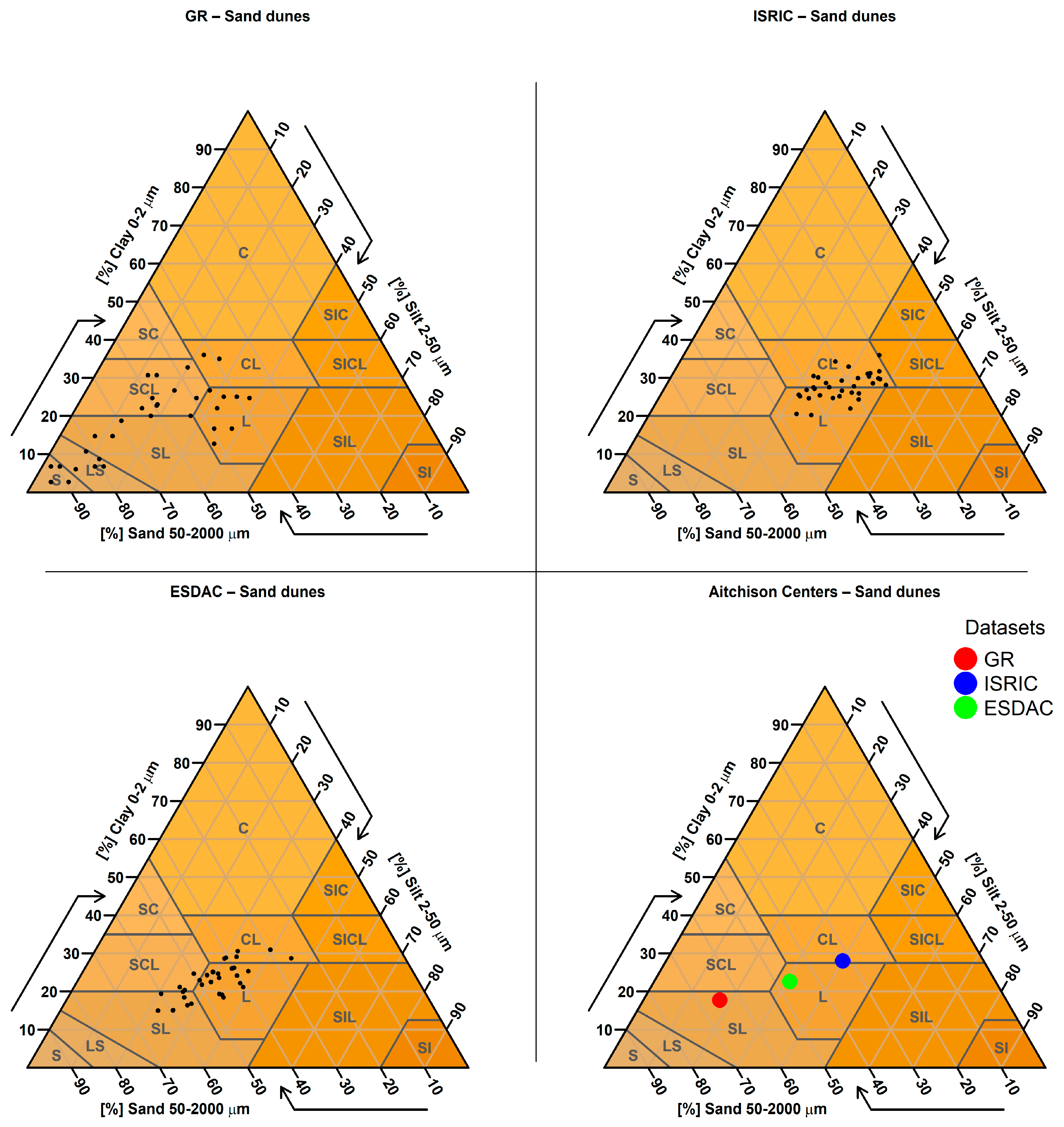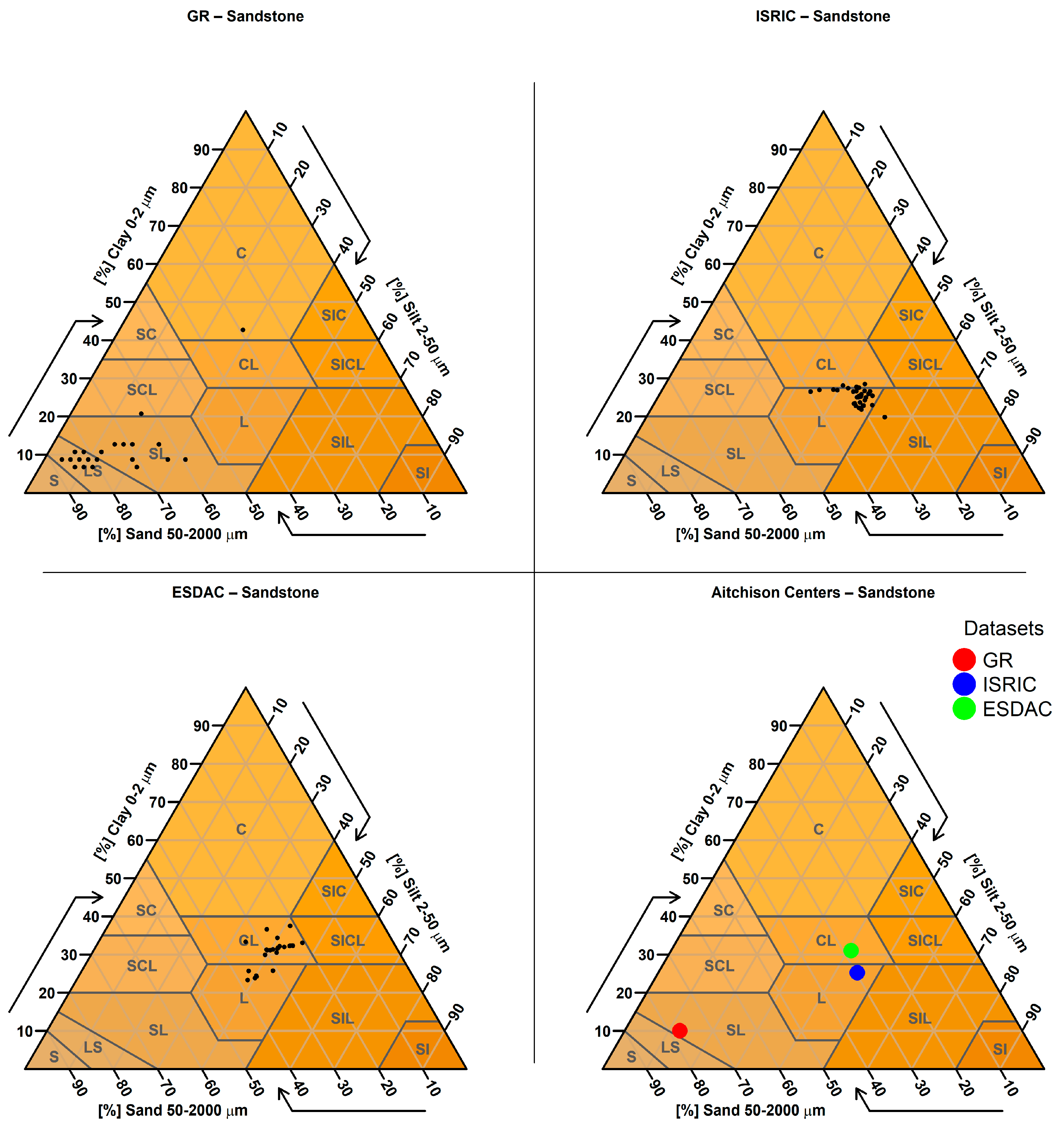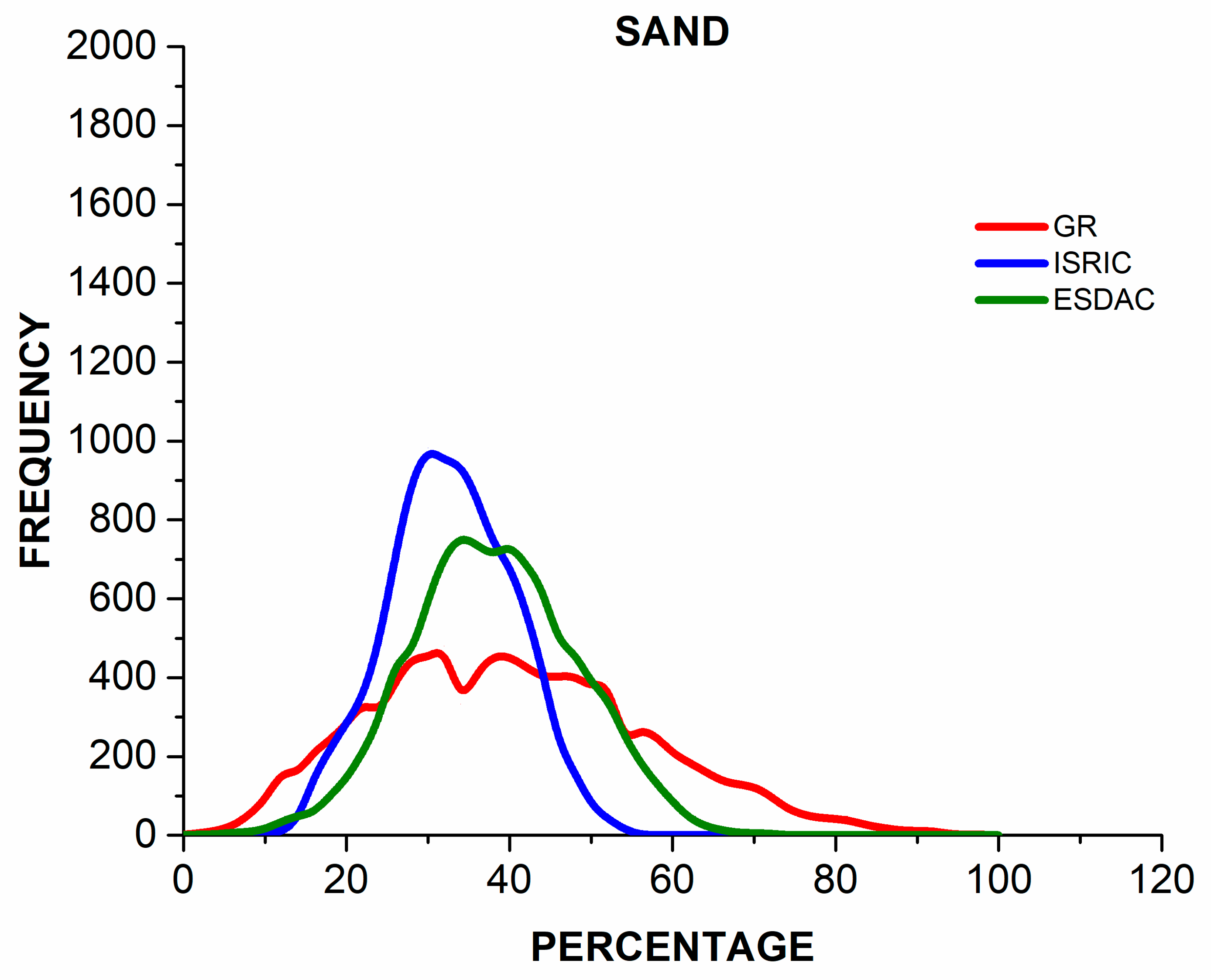 | Parent Material (Number of Points) | GR Mean Sand % (Std) | ISRIC Mean Sand % (Std) | ESDAC Mean Sand % (Std) |