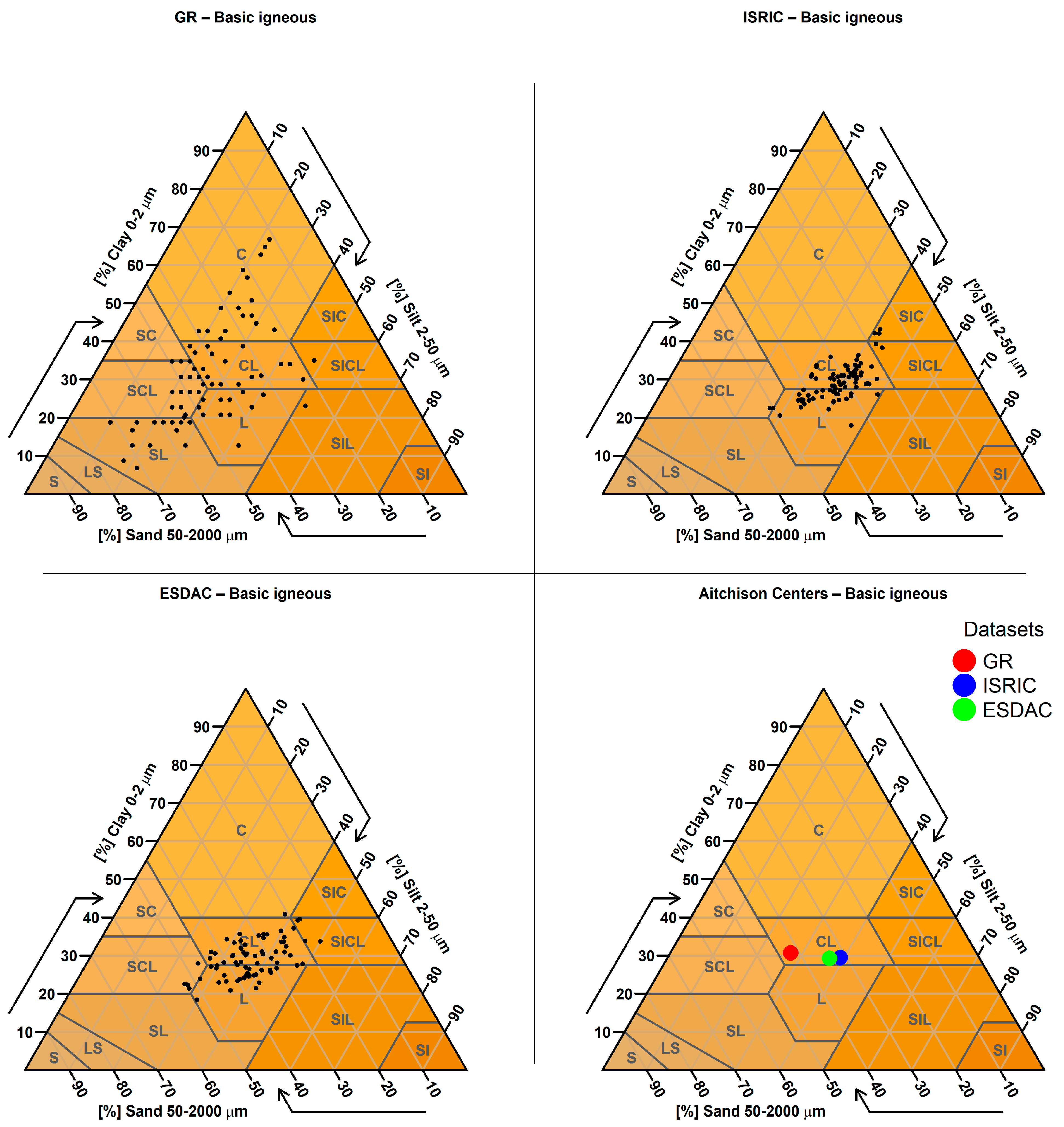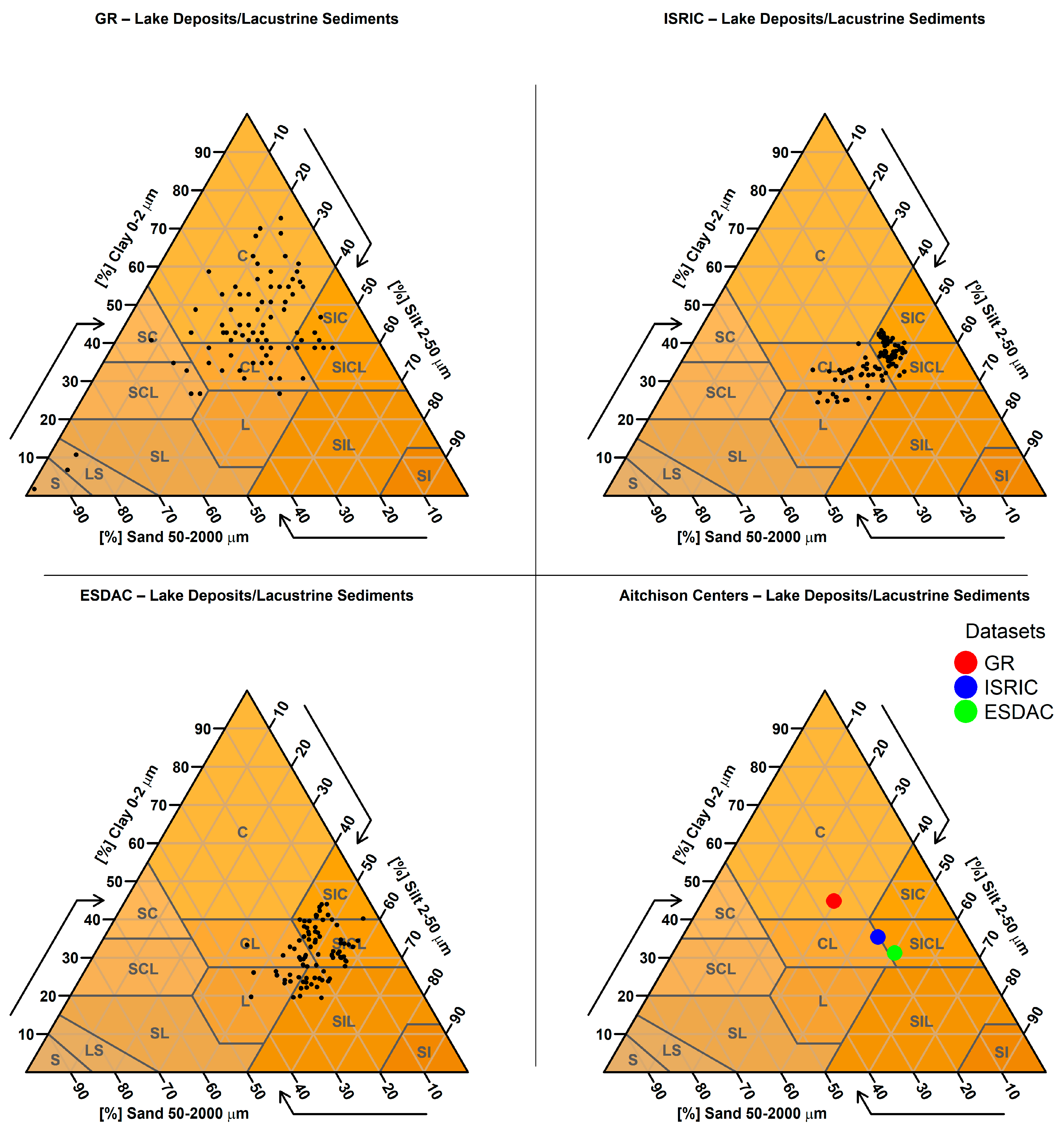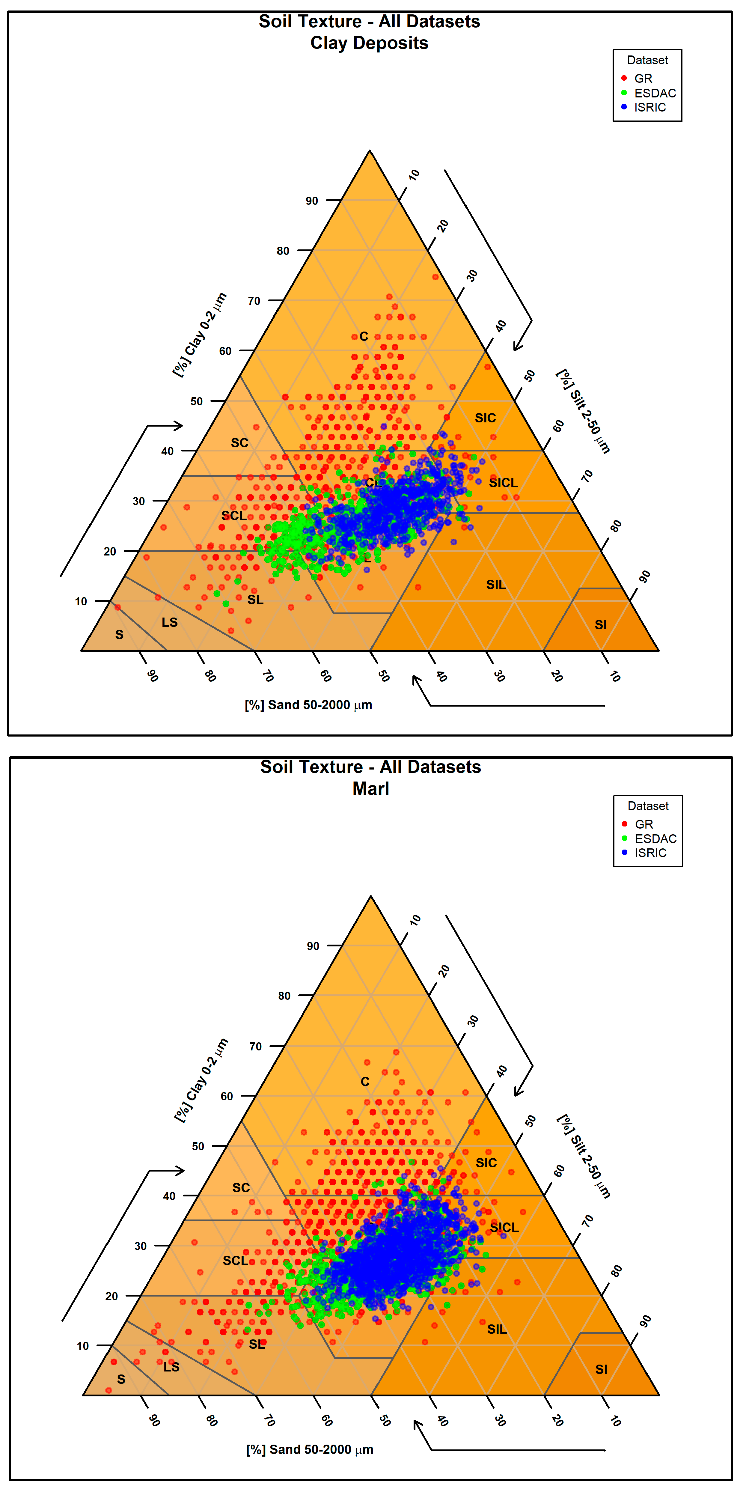 | Parent Material (Number of Points) | GR Mean Clay % (Std) | ISRIC Mean Clay % (Std) | ESDAC Mean Clay % (Std) |