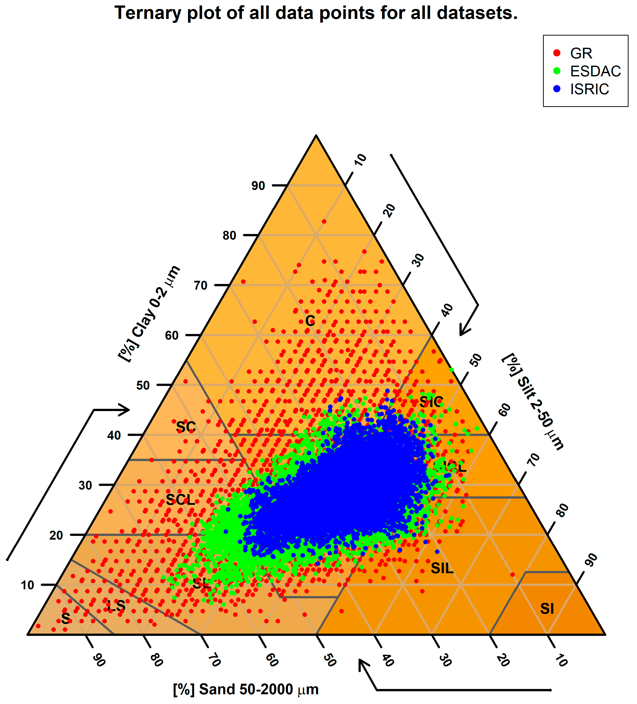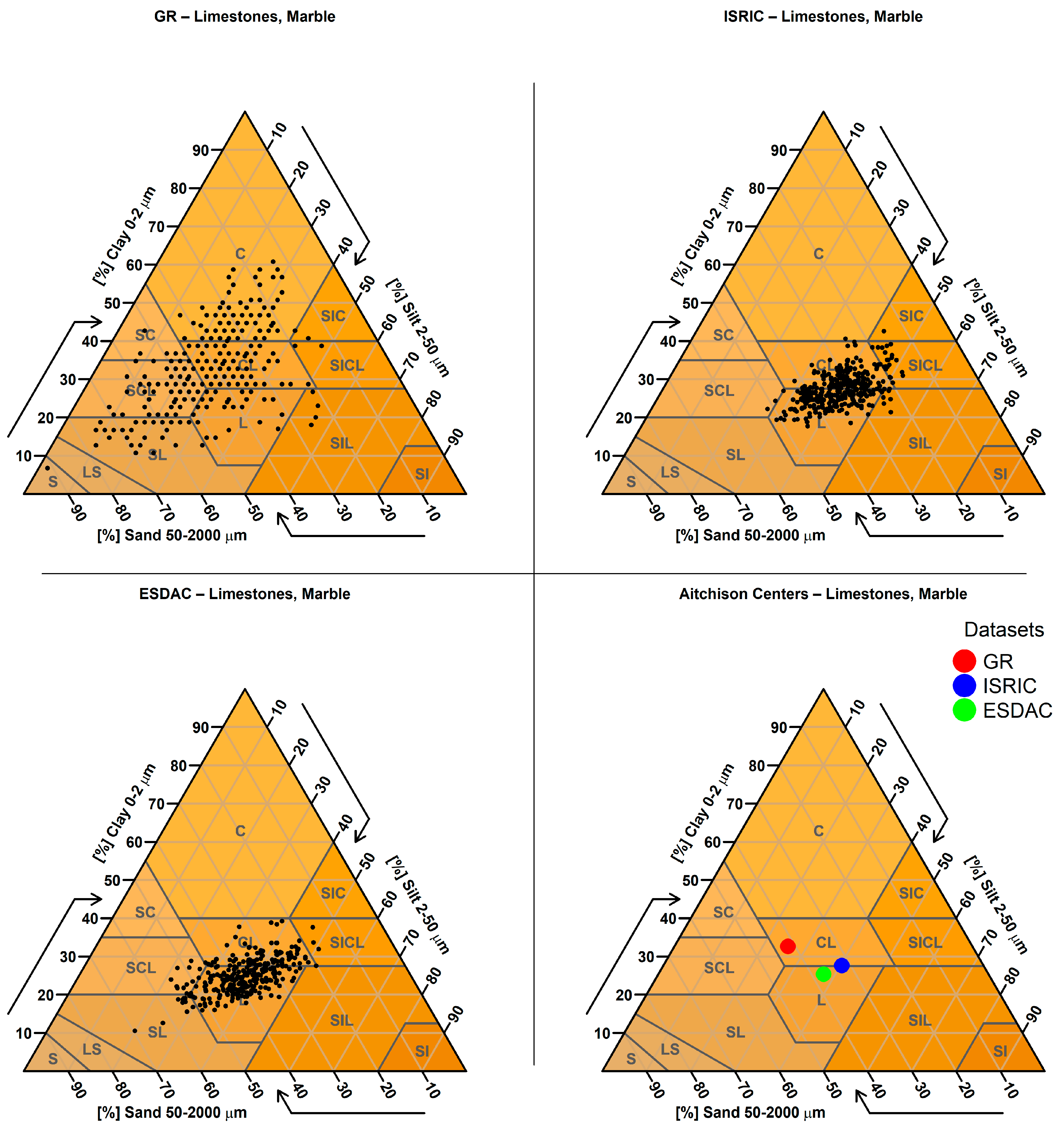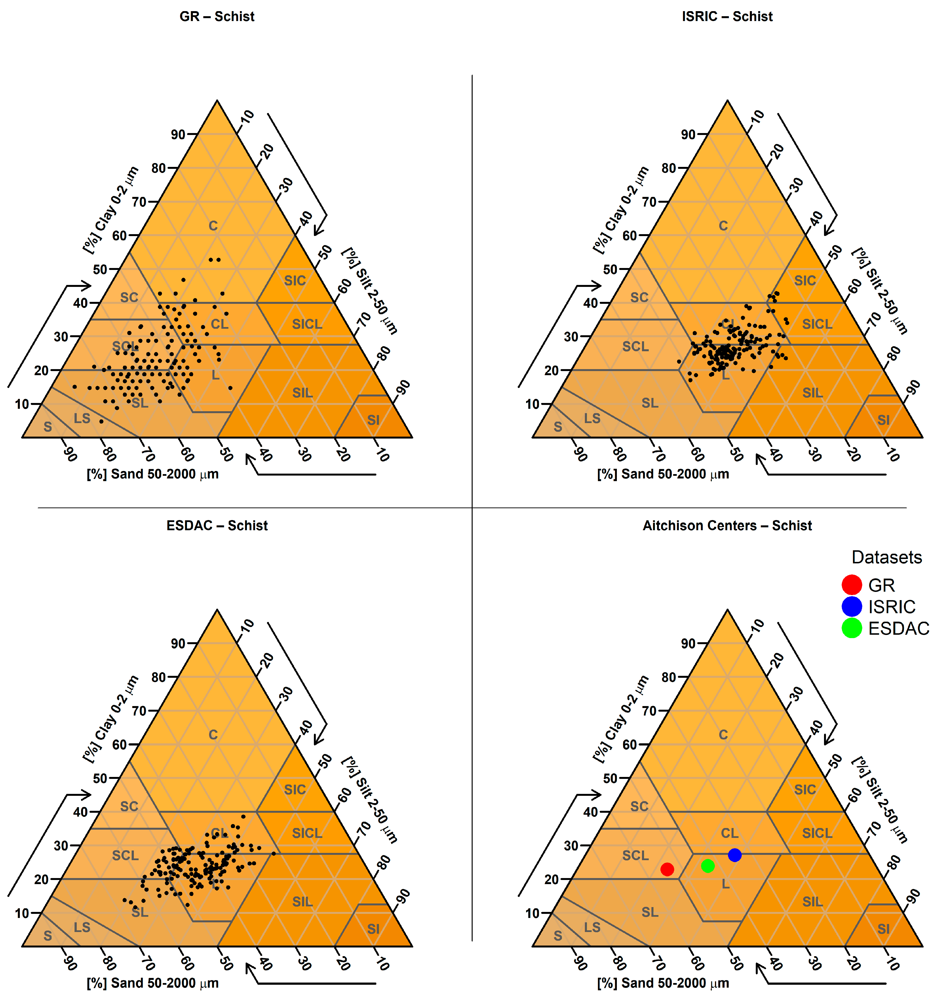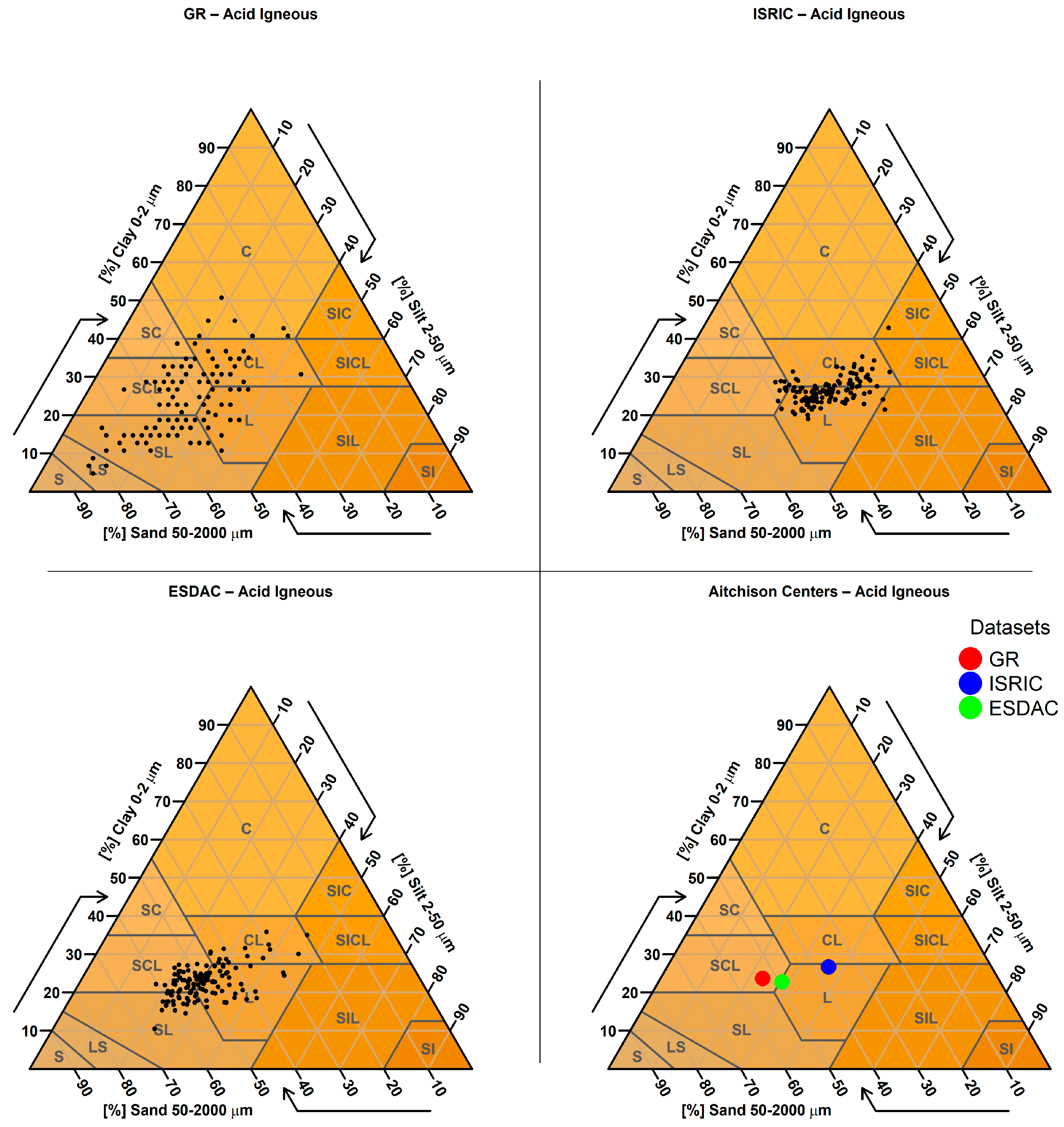 | Parent Material (Number of Points) | GR Mean Clay % (Std) | ISRIC Mean Clay % (Std) | ESDAC Mean Clay % (Std) |