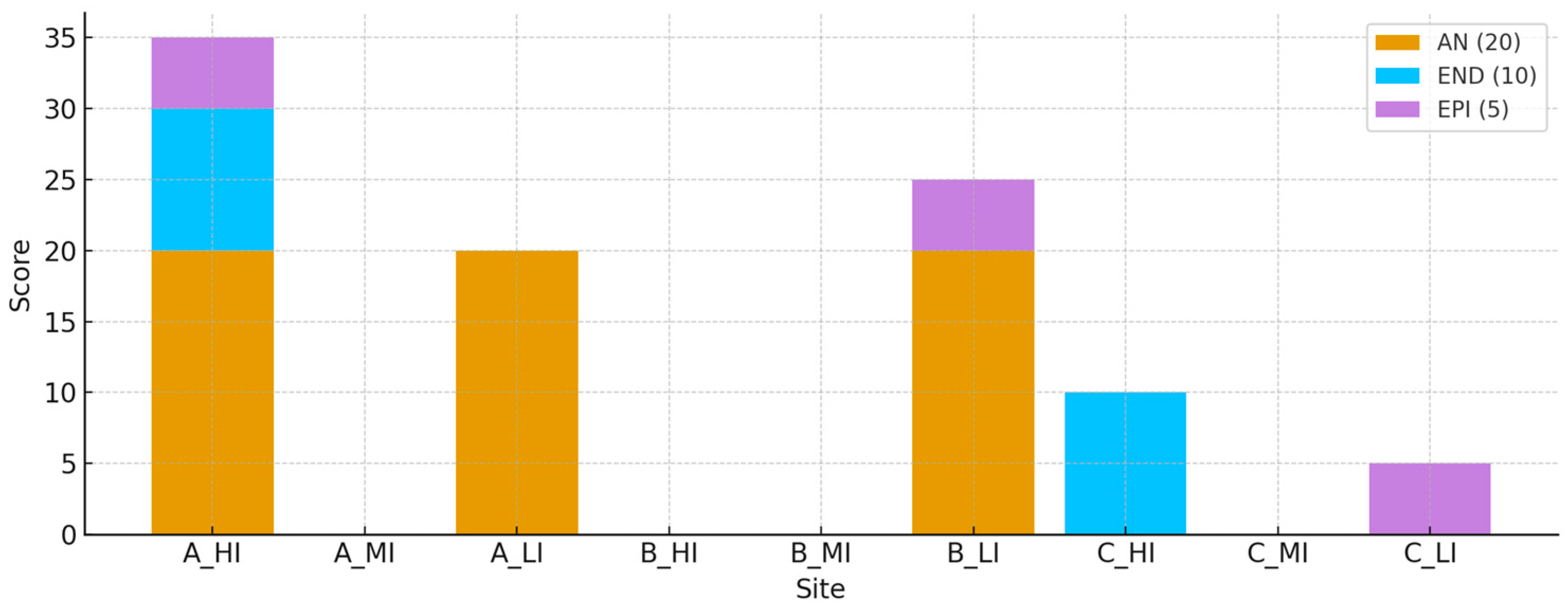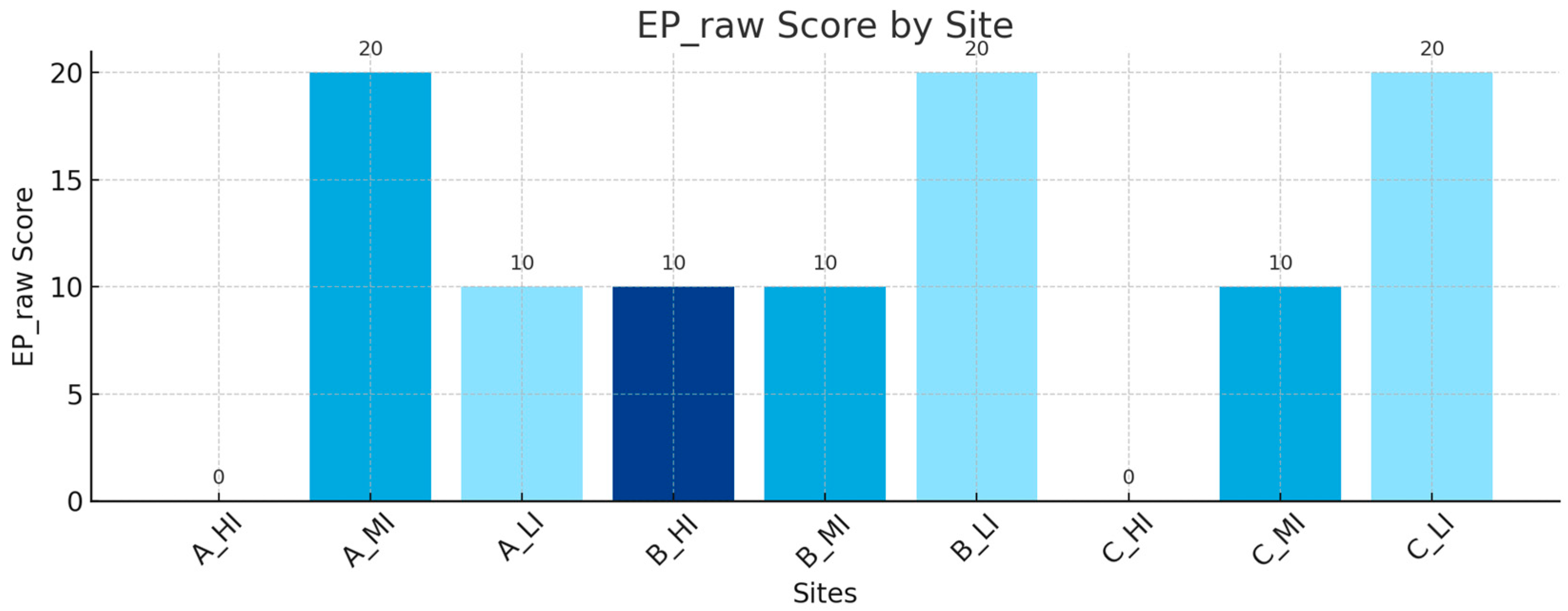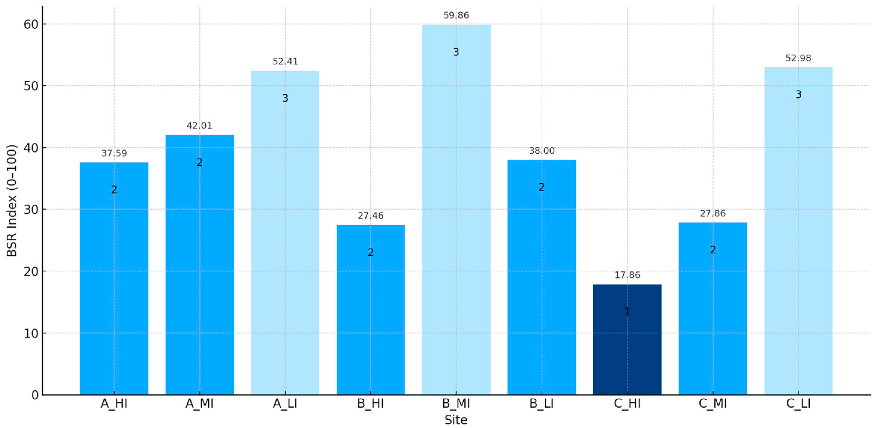 | Site | AR_raw (0–353) | AR_norm (0–100) | EP_raw (0–20) | EP_norm (0–100) | EW_raw (0–35) | EW_norm (0–100) | BSR_Index (0–100) | Resilience Class |