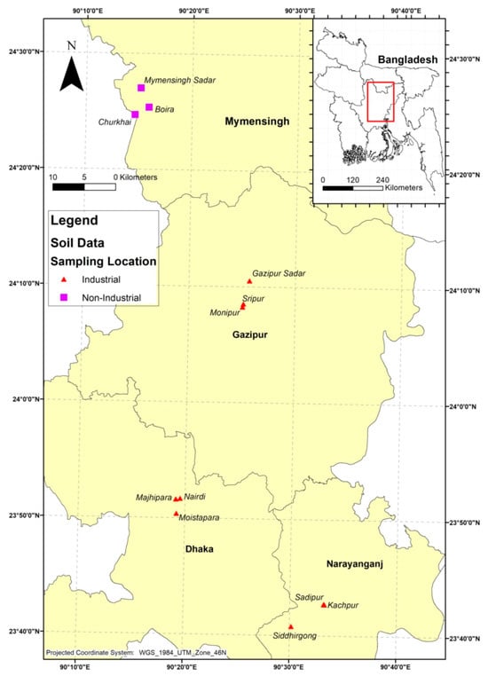 Map of the homestead agricultural soil sampling areas in Bangladesh, with red triangles indicating industrial areas and purple quadrilaterals indicating non-industrial areas.