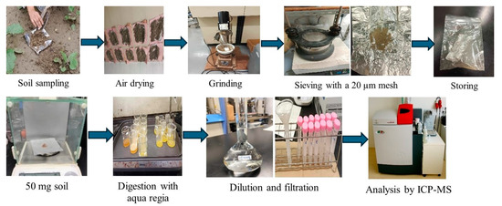 In the laboratory, soil samples were cleaned, air-dried, and then ground and sieved using a mechanical shaker (AS 200-digit Retsch AS200, Retsch GmbH, Haan, Germany). The sieved samples were wrapped in aluminum foil and stored under refrigeration until analysis. Subsequently, the samples were oven-dried at 105 °C to a constant weight, further ground using an agate mortar, and passed through a 20 µm mesh to ensure homogenization. For digestion, 0.5 g of soil was treated with aqua regia (HNO3:HCl = 1:3) [29] and heated on hotplate (Zojirushi EA-DD10-TA, Zojirushi Corporation, Osaka, Japan) at 150 °C for approximately 90 min or until brown fumes ceased. The digested samples were then cooled, diluted with deionized water, filtered, and stored at 4 °C until heavy metal analysis (Figure 2).