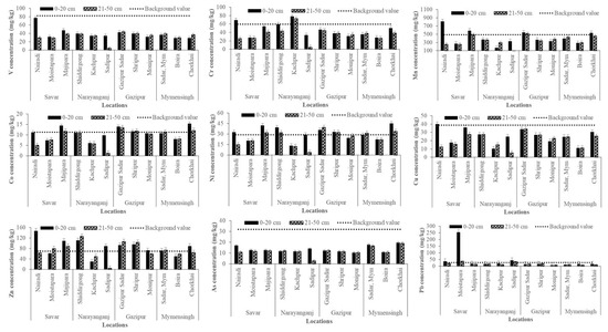 Additionally, Pb demonstrated the pronounced contrast, averaging 47.91 mg/kg in industrial soils compared with 14.42 mg/kg in non-industrial areas. The maximum Pb concentration exceeded the FAO/WHO guideline of 100 mg/kg, likely due to emissions from battery manufacturing, smelting, and vehicular activities [30]. In contrast, As levels were higher in non-industrial subsurface soils than in industrial soils. This unexpected trend may reflect natural geological variability, prolonged irrigation with As-contaminated groundwater or agrochemical inputs in rural areas [41,48]. V concentrations were nearly identical across both zones and depths, indicating predominantly geogenic origins. The consistently higher concentrations of Cr, Ni, Cu, Zn, and Pb in industrial soils confirm the strong anthropogenic footprint of local industries. These findings align with previous reports from Bangladesh and other developing countries, where inadequate waste management and unregulated industrial discharge contribute to heavy metal accumulation in peri-urban agricultural soils [48,51]. Conversely, Mn, Co, As, and V appear to be primarily geogenic or influenced by non-industrial activities. Notably, the elevated Pb levels in Savar and Narayanganj reflect the impacts of informal smelting and vehicular emissions, whereas the higher As concentrations in Mymensingh likely result from irrigation with contaminated groundwater [39], suggesting that not all metals are equally influenced by industrial sources.