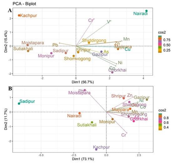 For subsurface soils, PCA explained 84.3% of the variance (Dim1: 73.1%, Dim2: 11.2%), suggesting clear discrimination of deeper soil contamination (Figure 4B). Sadipur and Nairadi are distinctly positioned, showing significant differences in the metal concentrations compared to other locations. Moistapara showed strong association with Pb, while Gazipur was dominated by Co, Ni, Cu, and Zn, indicating contamination from industrial activities such as chemical manufacturing, wastewater discharge, urbanization, and vehicular emissions, as well as agricultural practices involving contaminated fertilizers and manure [58]. Chorkhai and Mymensingh Sadar clustered with As and V, indicating possible influences from agrochemical applications and lithogenic sources [39]. Kanchpur was dominated by Cr, likely from tannery and metallurgical activities, while Sadipur and Nairadi showed weaker associations with heavy metals.