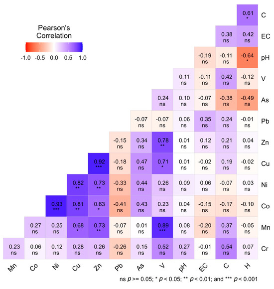 Pearson’s correlation matrix (Figure 5) revealed strong positive associations among several heavy metals, suggesting common anthropogenic sources or shared geochemical behaviors in homestead agricultural soils. Notably, Mn-Ni (r = 0.93, p < 0.001), Mn-Cu (r = 0.93, p < 0.001), and Co-Ni (r = 0.92, p < 0.001) exhibited highly significant correlations, indicating shared industrial or lithogenic origins and similar mobilization tendencies in soil environments [41,53]. Similarly, strong correlations between Cu-Ni (r = 0.81, p < 0.001) and Zn-Pb (r = 0.78, p < 0.01) suggest co-contamination likely originating from alloy production, galvanizing, and battery related industries [60]. In contrast, negative correlations were observed between Pb-pH (r = −0.64, p < 0.05) and As-pH (r = −0.49, p < 0.05), indicating enhanced solubility and mobility of these metals under acidic soil conditions [59]. Correlations that were statistically insignificant (p > 0.05) suggest heterogeneous contamination pathways involving mixed industrial, vehicular, and agrochemical sources. The correlation coefficient (r) ranges from −1 to +1, with 0 indicating no linear relationship between variables. The strength of correlation coefficients was interpreted based on standard statistical conventions, where r < 0.3 denotes a weak correlation, 0.3 ≤ r ≤ 0.7 denotes a moderate correlation, and r > 0.7 denotes a strong correlation [61]. These results underscore soil pH as a key regulator of the geochemical behavior of potentially toxic elements, particularly Pb and As, whose bioavailability tends to increase in low-pH environments [62].