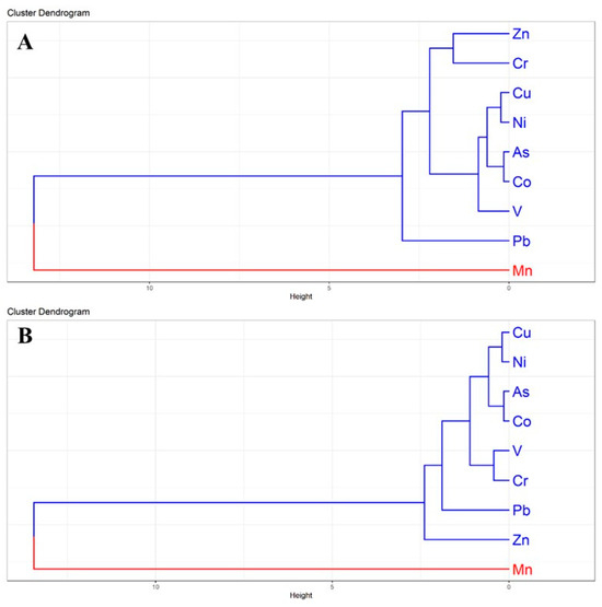 Hierarchical Cluster Analysis (HCA) dendrogram illustrating the grouping and categorization of heavy metals in homestead agricultural soils: (A) surface soils (0–20 cm) and (B) subsurface soils (21–50 cm). Colors represent the major clusters.