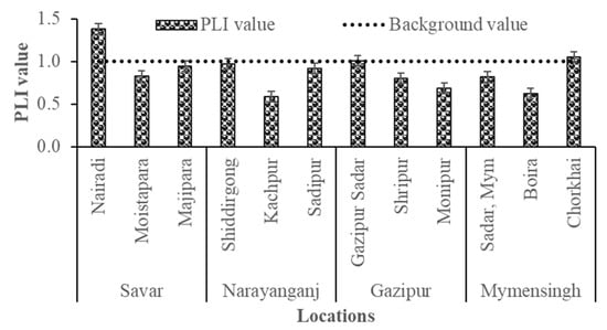The Pollution Load Index (PLI) values varied notably across the study sites, ranging from 0.62 to 1.39, indicating both uncontaminated and polluted conditions (Figure 7). Industrial areas such as Nairadi and Gazipur Sadar exhibited PLI values above unity, suggesting substantial ecological risk and progressive soil quality deterioration, primarily due to emissions from tanneries, metal processing, and galvanizing industries [56]. Moderately elevated contaminations were observed in Majhipara, Sadipur, Moistapara, and Shiddirgonj, reflecting ongoing contamination pressures from peri-urban industrial activities. Interestingly, the non-industrial site Chorkhai also displayed a high PLI, likely due to diffuse pollution from agrochemicals or contaminated/wastewater irrigation and vehicle emission [55]. By contrast, Kanchpur, Monipur, and Boira showed relatively low PLI values, suggesting minimal contamination and safer conditions for agricultural use. However, the PLI assessment indicates that industrial activities are the primary drivers of heavy metal pollution in homestead agricultural soils, with several locations already surpassing the pollution threshold. The findings highlight the need for improved industrial waste management, regular soil quality monitoring, and targeted mitigation strategies to safe food supply and human health in industrial peri-urban communities [47].