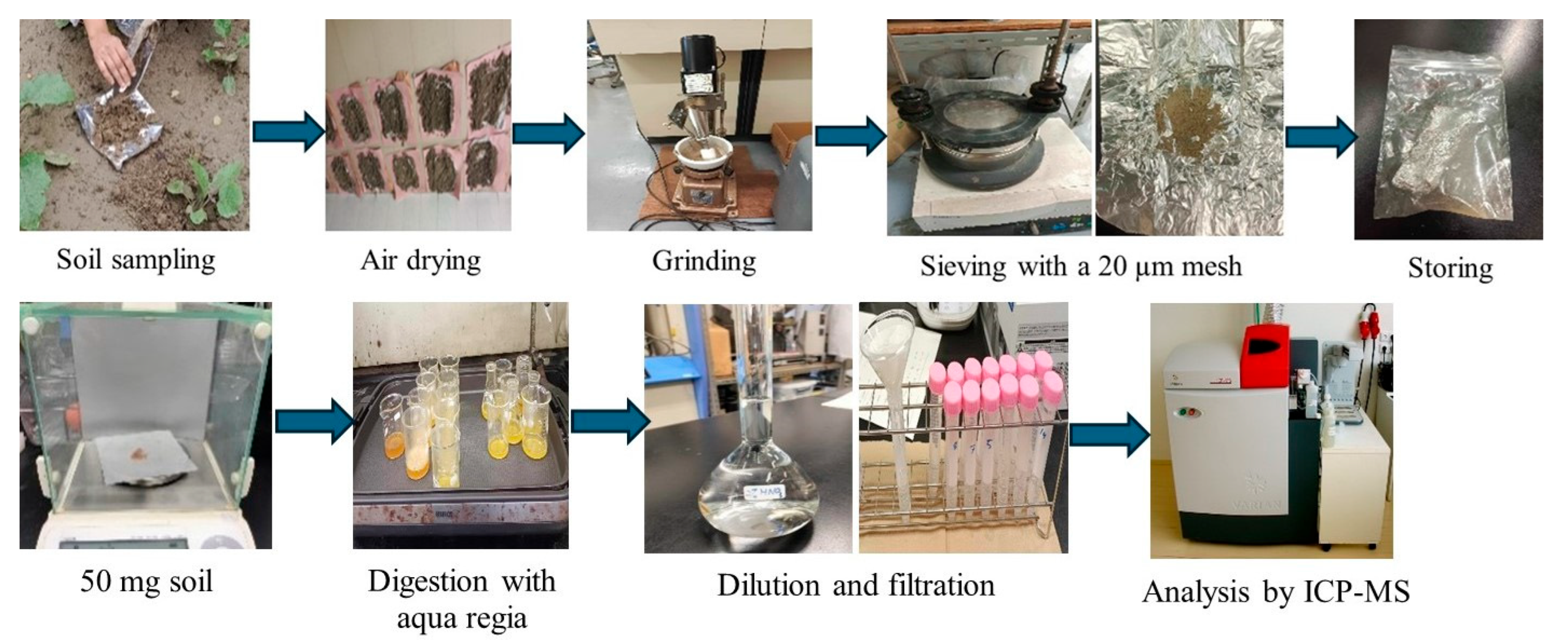 In the laboratory, soil samples were cleaned, air-dried, and then ground and sieved using a mechanical shaker (AS 200-digit Retsch AS200, Retsch GmbH, Haan, Germany). The sieved samples were wrapped in aluminum foil and stored under refrigeration until analysis. Subsequently, the samples were oven-dried at 105 °C to a constant weight, further ground using an agate mortar, and passed through a 20 µm mesh to ensure homogenization. For digestion, 0.5 g of soil was treated with aqua regia (HNO