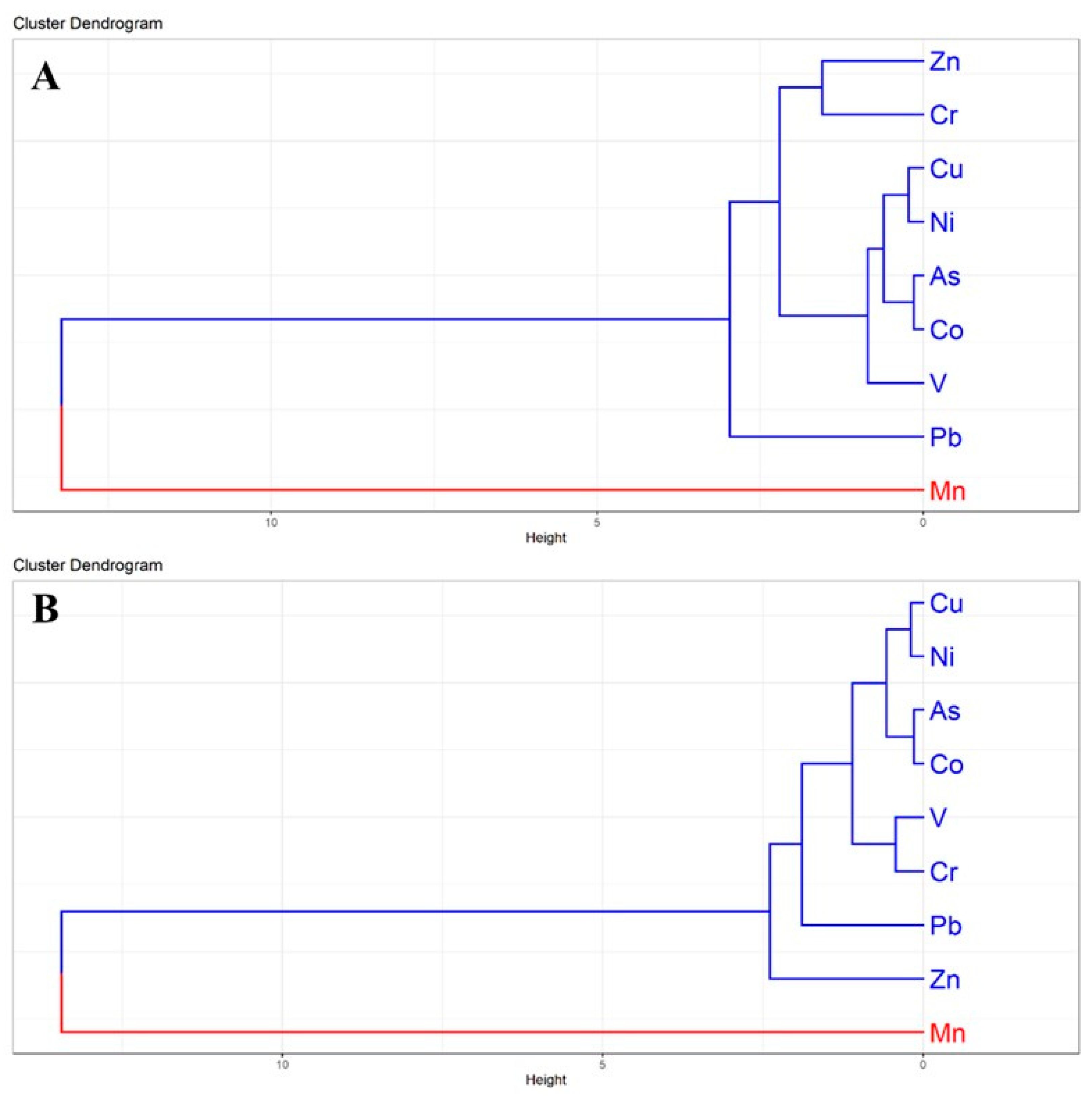 41]. The background concentrations used were as follows: Cr (59.5 mg/kg), Mn (488 mg/kg), Ni (29 mg/kg), Zn (70 mg/kg), Cu (38.9 mg/kg), Pb (27 mg/kg), Co (11.3 mg/kg), V (82.4 mg/kg), and As (5.2 mg/kg). The