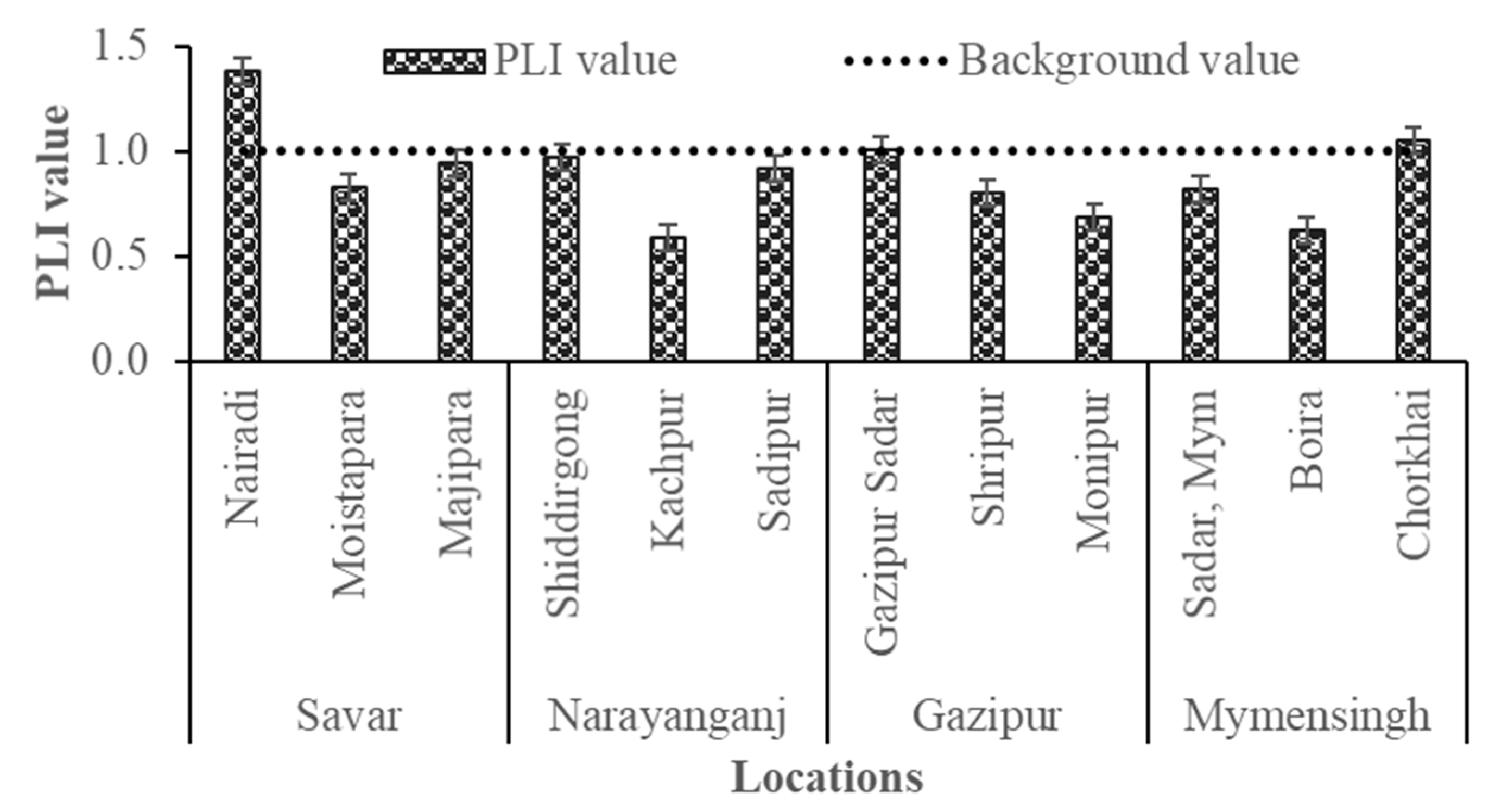 PLI) provides a cumulative indication of overall heavy metal pollution at a sampling site. It is calculated as the geometric mean of the