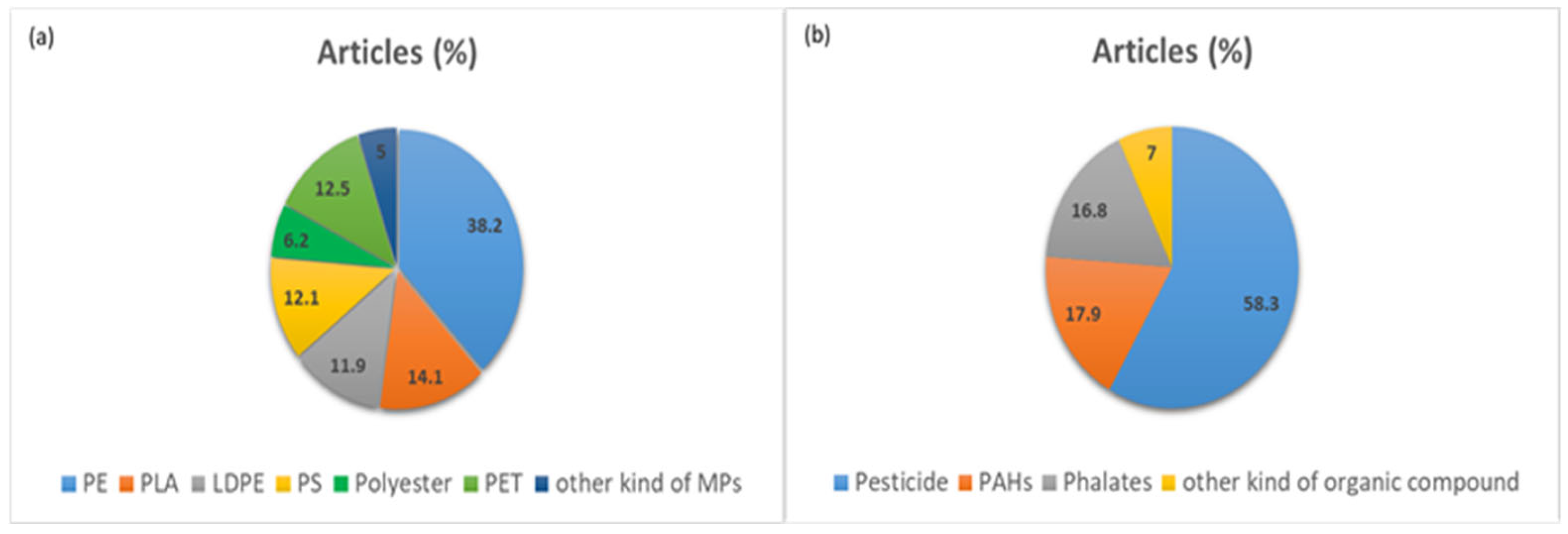 | PE and PLA | Four groups (3,5-DCA, MPs, MPs + 3,5-DCA, and control with no MPs or 3,5-DCA): 0.1%, 0.2%, and 2%, respectively | 50–100 μm | 7.41 | 0–20 cm, Organic matter: 29 g kg−1, Cation exchange capability 8.9 cmol+ kg−1 ST: Yellow loam soil Pot experiment | Chive: Allium ascalonicum | 3,5-dichloroaniline (3,5-DCA): a toxic metabolite of dicarboximide fungicides | 10 mg kg−1 | [107] |