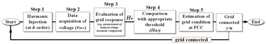 The equation above describes anti-islanding techniques that periodically inject a low current harmonic component, and estimate the grid condition at PCC (grid-tied or islanded) based on the evaluation parameter, Hh, and a predefined threshold value (Hthr). Normally Hh is based on Equation (1), while typically the condition Hh > Hthr indicates the islanded-operation of the installation. Grid response is usually evaluated through a DFT algorithm, as in references [2,3,4], by other means such as through cross-correlation, as in references [2,5,6], or through a Goertzel algorithm, as in reference [7]. A comprehensive comparative review on the above methods can be found in reference [8]. Various PL values have been used, while the effect of the anti-islanding schemes on the quality of the delivered power has also been studied. However, in reference [8], the PL level values were achieved by adjusting the power of a single grid-tied inverter along with the internal impedance of the grid transformer. As such, the concept of multiple inverters was not achieved in that work.