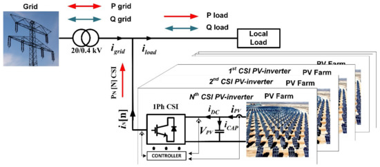 Until recently, for these installations, the guidelines concerning the integration of PVs were relatively modest, including only few basic demands for the PV installation, requiring the THDi of the inverter output injected current to be less than 5%, while the DPF needed to be close to unity. Therefore, the common (and cost effective) practice concerning the control of these systems has involved two main tasks: to track the maximum power from the PV-panel (by applying an MPPT control); and to inject a current waveform with a low THDi and unity DPF (e.g., by synchronizing with the utility voltage through a PLL). On the other hand, the power production of these installations typically varies between 0.1 and 10 kW, being characterized by low PL levels thus far. However, the continually rising share of renewable energy sources is currently pushing towards innovative solutions that will allow higher levels of renewable sources to be integrated into the low (and medium) voltage networks. A sign of this direction comes from the new IEEE 1547-2018 standard, which states that new DERs should be, among other capabilities, able to provide ancillary services into the grid.