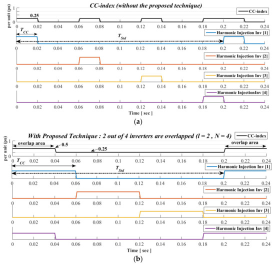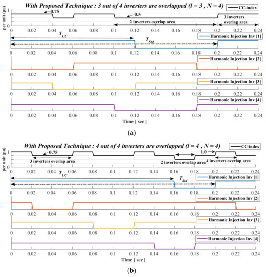 The proposed strategy is demonstrated in Figure 5 and Figure 6, where a set of N-subgroup inverters is considered. The CCindex is as well depicted in those figures, where 1 pu denotes the normalized CCindex that is generated by the overall of four inverters. Based on the presented results, the number, l, of inverters that overlap with each other, depends on the duration of their individual harmonic injection, denoted as TCC. It should be noted that TCC should be also the same among the inverters. For example, l = 3 implies that the harmonic injection of at least three inverters will overlap (see Figure 6a) with each other. It was noted that the proposed strategy indicates the minimum amount of overlapped inverters, even though there is a probability for more inverters to overlap as well.