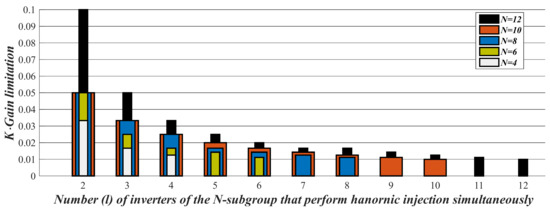 According to Equation (12), higher l-values impose stricter limitations in the K·Gain product. This restriction is dictated by the power quality standards and it is associated with the upper limit of K. The K·Gain limitation is plotted in Figure 7, as a function of l, for five indicative N-values (i.e., N = 4, 6, 8, 10, 12). According to Figure 7, larger N-values enable the harmonic injection of the inverters to be overlapped with a lower limitation. For example, the limitation of K·Gain when two inverters are overlapped is 0.1 when the total number of inverters is 12, whereas it becomes 0.05 (much stricter) when less inverters are available. This happens because the same number of inverters can be overlapped with shorter injection durations when a larger total number of inverters is available. On the other hand, for the same l/N ratio, the K·Gain limitation gets stricter for higher N-values. Another notable factor that can be seen in Figure 7 is the round-down of the K·Gain values. The round-down is caused by the obligation of TCC being an integer multiple of Tb. Thus, various l, N combinations might lead to the same K·Gain limitation. For example, note that for l = 10 & N = 10, and for l = 12 & N = 12, the same limitation of 0.01 stands.