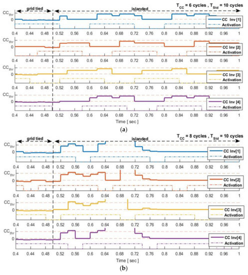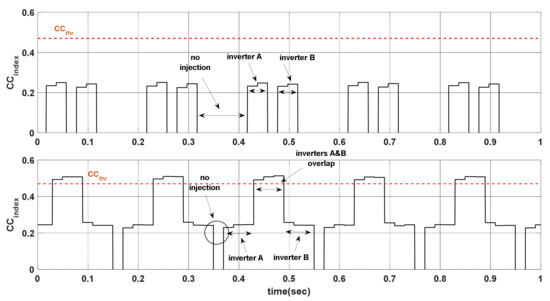 In Figure 11, the CCindex of both cases in an islanded-operation is illustrated. In the first case, the CCindex does not surpass the predefined CCthr as a result of the lack of power in the second harmonic, meaning the anti-islanded method fails. In second case, when inverters are overlapped, the CCindex surpasses CCthr and the method detects the islanded-operation.