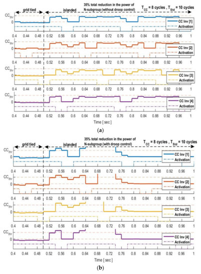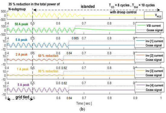In this subsection, the system undergoes a power reduction to investigate the impact of the inverter power and droop controller on the proposed technique. To do that, two subcases were simulated. In the first subcase the droop-controller was activated, whereas in the second one, the droop controller was inactive. According to the simulation results, the evolution of CCindex when the droop-controller is inactive (Figure 9a) was reduced by ~28% with respect to its initial value that is depicted in Figure 8, thereby failing to detect the islanded operation. On the other hand, the reduction of CCindex was effectively countered by the droop-controller (Figure 9b), leading to the successful detection of the islanded operation. Corresponding waveforms of inverters currents and PCC voltage are illustrated in Figure 10.