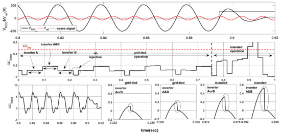 Figure 12 illustrates the evolution of CCindex along with VPCC and Vref, in both islanded and grid-tied operation, and the evolution of the integration in the case of overlapping inverters. Finally, in accordance with the aforementioned standards, the island was detected in less than 10 fundamental cycles.