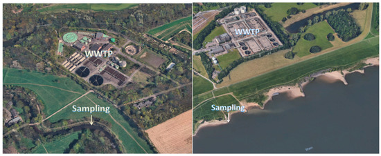 Sampling of the river Erft (left) and Rhine (right) near a WWTP, (pictures: © 2018 Google, GeoBasis-DE/BKG (© 2009), Google).