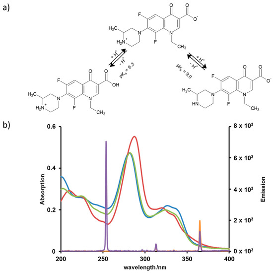 In neutral solutions, fluoroquinolones occur as zwitterions, as can be recognized from their pKa values. This property exercises influence on the photoinduced degradation through directing the chemical transformation and through the UV absorption efficiency, which depends on the pH as well, see Figure 2a. The spectral range of the irradiation also affects the quantum efficiencies. Hence, UVC or UVA lamps used in this study may lead to different transformation pathways and products. In order to predict conditions for efficient degradation of LOM, absorption spectra were recorded at different pH values and compared with the emission spectra of the lamps, see Figure 2b.