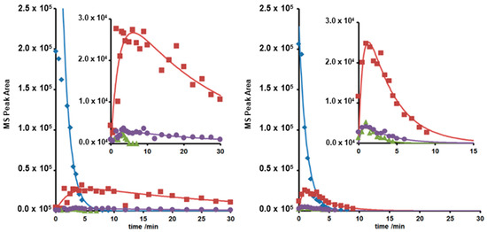 Kinetic analysis of degradation profiles followed first-order or pseudo first-order kinetic models, consecutive and subsequent follow-up reaction models, cf. Equation (1), according to previous studies and theory [26,32,33,34,35,36,37]. The complete kinetic description is represented in the Supplementary Information.