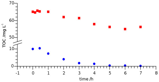 The total organic carbon (TOC) was determined using a TOC analyzer (TOC-V CSN Series Shimadzu, Kyoto, Japan). Calibration was performed between 2 and 20 mg L−1 carbon using solutions of sucrose. The pH of all samples was adjusted to 1–3 using concentrated sulfuric acid. Subsequently, potentially resulting gases in the samples were removed by ultrasonification for 15 min. Samples were taken before irradiation and during irradiation after 15, 30, 45, and 60 min and every hour for a total of 7 h. Injection volume was 150 μL for each sample. The device was controlled and results evaluated using TOC-Control software (Shimadzu, Kyoto, Japan). Each sample was measured in triplicates. Mean values yielded the concentrations. Prior to measurements, the TOC analyzer was equilibrated with the new sample to remove residual carbon. In addition, between each LOM sample acidified and degassed MilliQ water was measured.
