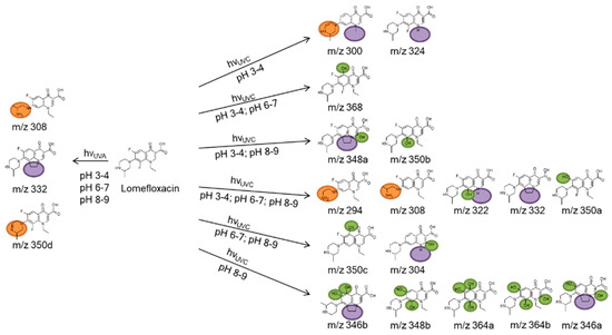 Identified photodegradation products of LOM formed by OH radical addition (green), alteration of the piperazine moiety (orange), the nitrogen substituent (purple), and the quinolone ring (blue).