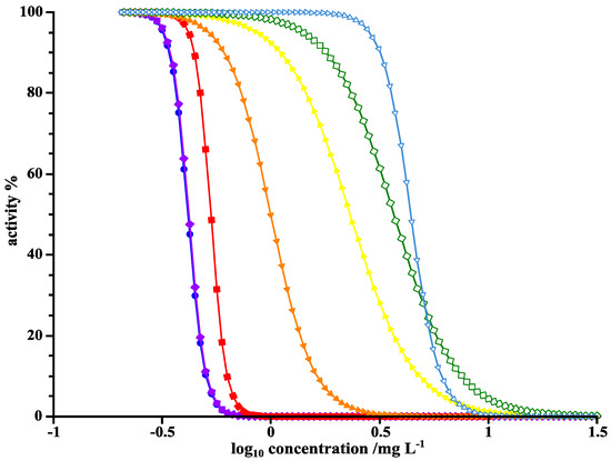 To assess the ecotoxicity of the resulting products and intermediates of the photoinduced elimination of LOM, IC50, and MIC values were determined. The MIC value of LOM against B. subtilis was found 0.17 µg·mL−1, and 0.92 µg·mL−1 against P. fluorescens. The IC50 value of LOM against B. subtilis was 0.09 µg·mL−1 and 0.22 µg·mL−1 against P. fluorescens. As discussed in previous studies, IC50 values can be determined more accurately than MIC values due to their graphical representation [9]. Yet, an error of a factor of 2 is negligible due to the dilution assay format. A factor of 4 between IC50 and MIC in the case of P. fluorescens is rather large. Example curves for IC50 determination are given in Figure 7.