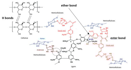 The treatment of lignocellulosic biomasses by alkaline solutions induces several mechanisms. Cellulose swells due to the disruption of intermolecular hydrogen bonds that bind cellulose molecules together [34]. In parallel, some alkali-labile linkages between lignin monomers or lignin and polysaccharides are broken (Figure 1). The ester-linked substituents of the hemicelluloses (acetate groups, uronic molecules) are also broken, as well as ester-linked phenolic monomers such as ferulic acid (FA), p-coumaric acid (p-CA) and sinapic acid [16,35,36]. This improves the digestibility of the undissolved hemicelluloses recovered in the solid residue and the dissolved hemicelluloses are quite similar to the native polysaccharides, except for the removed groups (acetate) or molecules (uronic acids, phenolic acids) [37,38]. The dissolved hemicelluloses contain a relatively small amount of bound lignin (0–5%) [39]. Xylans undergo only partial hydrolysis in alkaline solution at room temperature. An increase in the severity of the treatment (e.g., base concentration or temperature) produces smaller oligomers [24,39].