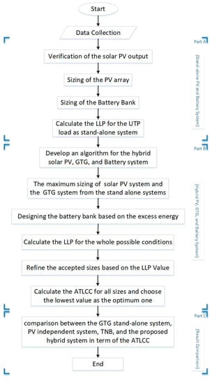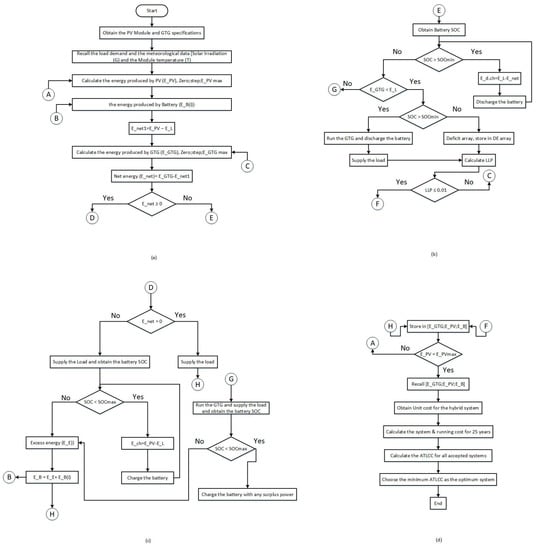 At the end of Figure 4a, if the value of = 0 then supply the load and save this value in the matrix of the accepted systems. If > 0, the battery is going to be checked, and, based on the result, there are two conditions. The first option if the battery is already full is the surplus power will be excess energy and used to redesign the size of the battery bank to fit the extra produced energy, and the second one is if the storage system is not completely charged; therefore, the excess energy will keep charging the battery until = , then the flow will go again to the first condition to resize the storage system. After the Figure 4c, process has ended, the new values of the system have been added to the accepted systems matrix. If < 0, in this case, the system automatically will go to the deficit energy section, which is placed in Figure 4b, to find the way to overcome the energy shortage either by the battery storage system or by the GTG. The deficit energy section is essentially trying to reduce the gap between the load demand and the generated energy. To achieve this, there are two options, the first of which is to discharge the battery system after checking its SOC to make sure that > . The second option is to run the GTG and increase its power production. Afterward, check the value of to make sure that there is no deficit power; if there is, it must be within the allowable limit of the LLP value. In case of the inability to reduce the gap to the accepted range in the power generation system, then the flow of the chart goes to system sizing section at Figure 4a, to find a way to overcome this disablement. The flowchart will keep flowing like this until all possible conditions are tried. Then, by filtering the results, the optimum size of the system units is decided in terms of the ATLCC of the system for 25 years.