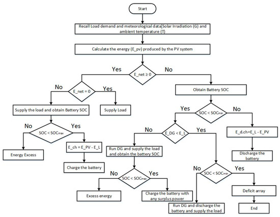 Equation (7) shows that the condition of charging the battery is not considered if the extra generated energy is enough to charge the battery or may exceed its maximum capacity. To overcome this disadvantage, there is necessary feedback to ensure that the proposed algorithm considers all the battery conditions. Similarly, at the right side of the algorithm, while checking the battery discharging process, there is no feedback to show when the battery is already fully discharged and when the diesel generator is needed to be operated to satisfy the demand of the system. Furthermore, the algorithm does not consider the value of LLP. Moreover, the optimum size of energy sources such as the PV array and the diesel generator has not been considered, nor has the storage system capacity. Besides, there is no use of the surplus power that has been generated from the PV array only or the diesel generator. The new algorithm covers all those disadvantages besides the economic analysis of the system.