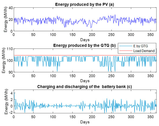 Energy production, (a) energy produced by PV array (b) energy produced GTG; (c) Battery charging and discharging energy.