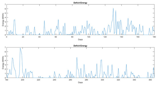 Figure 8 indicates the simulation results of the proposed algorithm in one year. Figure 8a, shows the produced energy by the PV power source. Moreover, the total energy resulted from the PV power source through the year is 6.464 GWh (17.7 MWh as the average production in the single day). Figure 8b, shows the GTG energy output in one year, which is 36.7 GWh (100.6 MWh as a mean daily output). Figure 8c, shows that the battery bank supply is only 4.8 MWh over the whole year. Meanwhile, Figure 9 presents 280 MWh deficit energy for one year. By using (5), the LLP of the suggested system is 0.0097. This value of LLP is not equal to zero, but it falls within the allowable range.