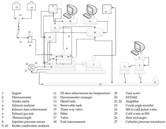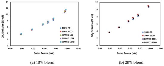 The engine test was performed at a constant speed of 1500 rpm and engine loads varied from minimum to maximum. The maximum power (100% rated load) was achieved for all fuel blends. The readings were taken at various loads—from minimum to maximum loads. The loads were kept constant for all blends. The same load was ensured using the controller of the Froude dynamometer. Repeated readings were taken and continuously monitored to ensure the readings were taken under the same load conditions. The fuels used in the engine were: fossil diesel, waste cooking oil, and WCO–additive blends (blends with diesel and butanol with a concentration of 10% and 20%; a gasoline concentration of 10% was used). Due to high volatility, 80WCO20G fuel was not tested in the engine. For each test, the engine first started with fossil diesel and operated for about 30 min before switching to the WCO blend fuel. After each test, the engine switched back to diesel fuel operation and operated for 30 min to flush-off the previous fuel from the system.