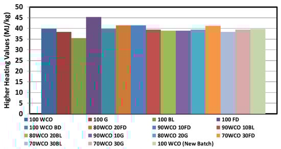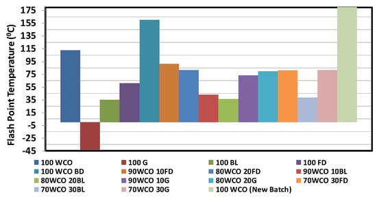 The calorific value of the fuel is an important property for achieving the required power output of the engine and assessing the engine performance characteristics. In general, for a given mass of fuel, the higher the calorific value the higher the power output will be. The calorific values of all fuel samples are shown in Figure 2. WCO blends with gasoline and butanol additives gave a lower HHV than WCO blends with fossil diesel additive (Figure 2). Higher flash point temperatures of fuels are desirable for transporting and storing of the fuels. The flashpoint temperature of the 100WCO fuel was found to be 75% higher than the corresponding value of fossil diesel (Figure 3). The flash point temperatures of WCO–FD blends with FD addition of 10%, 20% and 30% were higher than 100FD by 7.8%, 6.6% and 6.5%, respectively. The flash point temperature of butanol is low. WCO–butanol blends with 10%, 20% and 30% of butanol gave lower flash point temperatures than 100FD by 41%, 30% and 36%, respectively. The WCO mixed with gasoline at concentrations of 10%, 20% and 30% gave higher flash point temperatures than 100FD by 31%, 19% and 34%, respectively.