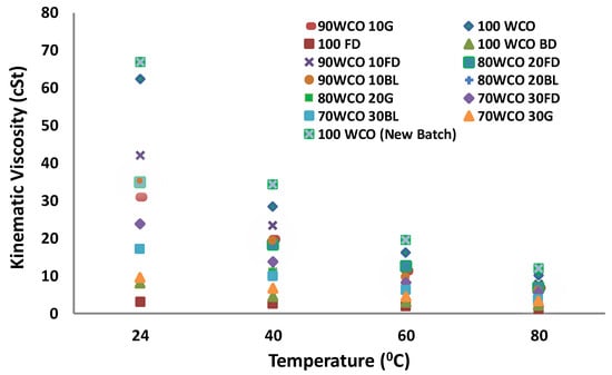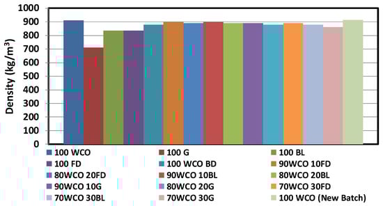 - The calorific value of the blends increased with the addition of fossil diesel additive. The flash point temperatures of the WCO blends reduced with the addition of additives. At room temperature, the density of the WCO blends with 20% diesel/butanol/gasoline contents dropped by 1%, 2.1% and 3.2%, respectively. The viscosities of WCO blends reduced with the addition of additives.
