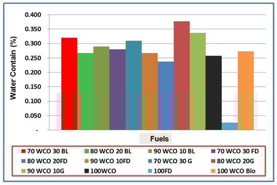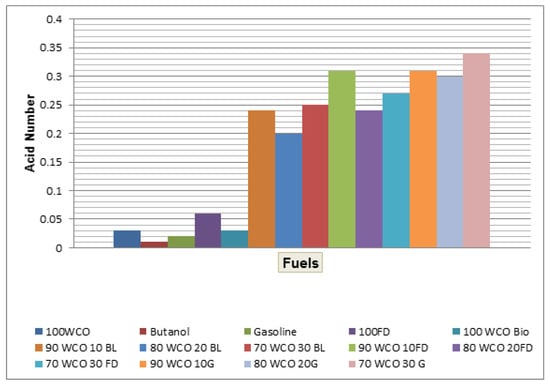 The density of WCO was higher than FD by 9% (Figure 4). The densities of WCO–FD blends with FD concentrations of 10%, 20% and 30% were higher than FD by 7.8%, 6.6% and 6.5%, respectively. In the case of WCO–butanol blends, they were higher than FD by 7.8%, 6.6% and 5.3%, respectively. Whereas, for WCO–gasoline blends, and for similar concentration ratios of additives, the densities increased by 6.6%, 5.4% and 2.9%, respectively, as compared to FD. When the density of the fuels is higher, relatively more fuels could be stored in the fuel tank and pumped through the fuel supply system. The viscosity of the fuel is very important as this property affects fuel flow and injection parameters. High-viscosity fuels lead to poor spray characteristic, and this results in an incomplete combustion of the fuels. Compared to 100WCO fuel, the viscosities of WCO–FD blends with 10%, 20% and 30% FD content decreased by 32%, 43% and 63%, respectively (Figure 5). Similarly, the viscosity of 100WCO decreased by 43%, 63% and 72%, respectively, when 10%, 20% and 30% butanol was added to neat WCO. On the other hand, the viscosities of the WCO–gasoline blends decreased by 50%, 74% and 84%, respectively (Figure 5), when gasoline was added to WCO at concentration of 10%, 20% and 30% (by volume). The presence of water in the fuel could lead to corrosion and incomplete combustion. Figure 6 shows that the maximum value of the water content was obtained with 80WCO20G fuel and the minimum value was with FD. The water content of a blend should be equivalent to the total water content of all components present in the blend. However, due to the measurement accuracies and possible new composition in the blend, this trend was not established (Figure 6). A small amount of water content in the blend might help to reduce the combustion temperature inside the cylinder which may lead a reduction in the NOx gas emission. Use of acidic fuels might damage injectors and other components of the engine. The acid number of the fuel depends on the chemical composition. The minimum acid value was recorded for butanol, and the maximum value was recorded for 70WCO30G blend (Figure 7). The acid number of the blends is higher than the neat fuels (Figure 7). It was thought that the chemical composition was changed by blending the fuels, and hence the acid number varied.