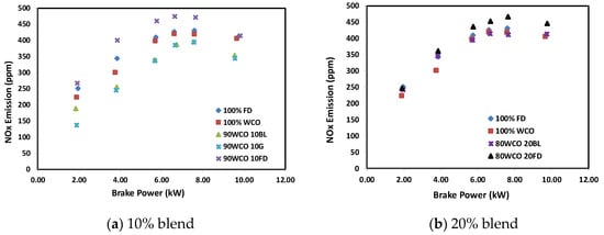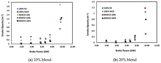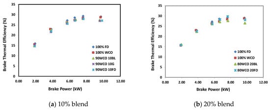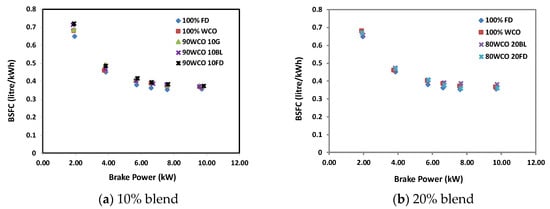 Figure 8 shows that at low loads, the BSFC of the WCO fuel with 20% FD and BL additives were higher than FD by 3.2% and 1.6%, whereas, at maximum load, they were higher than FD by 1.1% and 7.4%, respectively. The main reasons for higher BSFC values were higher density and viscosity values of the blends. A higher density and viscosity of the fuel causes poor spray characteristics and lead to poor combustion. In addition, lower calorific values of the blends caused more fuel to be consumed in order to produce the same load at constant speed [].