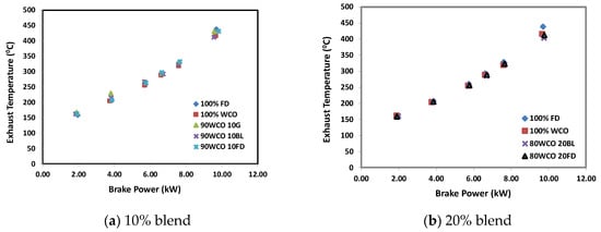 Figure 9 shows that, at low loads, most of the fuels gave almost identical thermal efficiency values. At maximum load, the thermal efficiencies of the 80WCO20FD and 80WCO20BL fuels were approximately 3% and 8.6% lower than FD. At a low concentration of additives, exhaust gas temperatures was almost similar to each other. However, in the case of higher additive concentrations and at low load condition, the exhaust temperatures were found to be similar for all fuels. Whereas, at maximum load, FD fuel gave the highest exhaust gas temperature than other fuels (Figure 10).