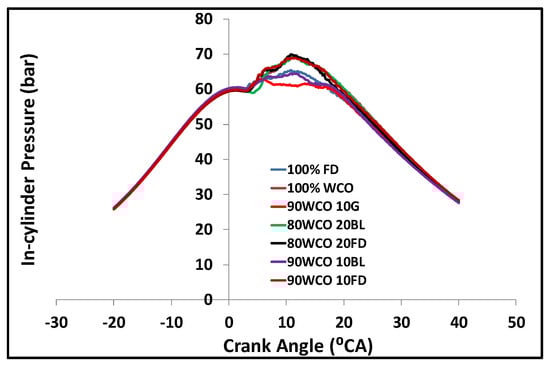 - At high loads, the peak in-cylinder pressures of 80WCO10-20FD fuels were approximately 4.4% higher than FD. At 70% load, in-cylinder pressures of the 80WCO20BL, WCO fuels and FD fuels were almost identical; the lowest peak in-cylinder pressure value was recorded for 90WCO10G fuel, lower than FD by 10%. At 100% load, the peak in-cylinder pressures for 80WCO20BL were 3.6% and 3.1% higher than 90WCO10BL and 100 FD. The 90WCO10G fuel gave a 5.4% lower in-cylinder pressure than neat FD operation in the full-load condition. The maximum heat release was recorded for FD. At 100% load, minimum heat release was observed for 90WCO10BL fuel, lower than FD by approximately 6.5%. The 80WCO20BL fuel gave a 2% higher heat release than the 90WCO10BL fuel; however, the peak heat release value of 80WCO20BL was about 5% lower than FD. Compared to FD, and in the full-load condition, the total combustion duration of the 80WCO20BL and WCO fuels decreased by approximately 13%. At 70% load, the combustion duration of the 80WCO20BL, 80WCO20FD and WCO fuels were lower than FD by approximately 8.4%.