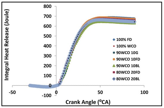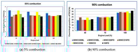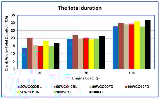 Total heat release varied due to the variation of the BSFC of the fuels (Figure 15). The maximum heat release at 70% load was recorded for FD (figure not shown). The minimum was recorded for 90WCO10G, lower than FD by 8.5% (figure not shown). At 100% load, minimum heat release was recorded for 90WCO10BL fuel, lower than FD by approximately 6.5%. The 80WCO20BL fuel gave a 2% higher heat release than the 90WCO10BL fuel; however, the heat release value of 80WCO20BL was about 5% lower than FD (Figure 15). In general, the additive fuels combusted (90% combustion) earlier than FD (Figure 16). At full load, the combustion (90% combustion) of the 80WCO20BL, 90WCO10BL, 80WCO20FD, 90WCO10FD, 90WCO10G and WCO fuels occurred earlier than FD by 11%, 5%, 11%, 8%, 8%, 3% and 14%, respectively (Figure 16). Figure 17 showed that use of additives led to a reduction in the total combustion duration. At full load, the total combustion duration of the 80WCO20BL, 90WCO10BL, 80WCO20FD, 90WCO10FD, 90WCO10G and WCO fuels decreased by 13%, 6.5%, 9%, 9%, 3% and 13%, respectively, when compared to the corresponding FD value (Figure 17). From the combustion characteristics results, it was observed that, in most cases, the ignition delay periods of the WCO–additive blend fuels increased when compared to fossil diesel. In addition, it was also found out that once burning started they burnt quickly. Similar results were also reported in the literature [,].