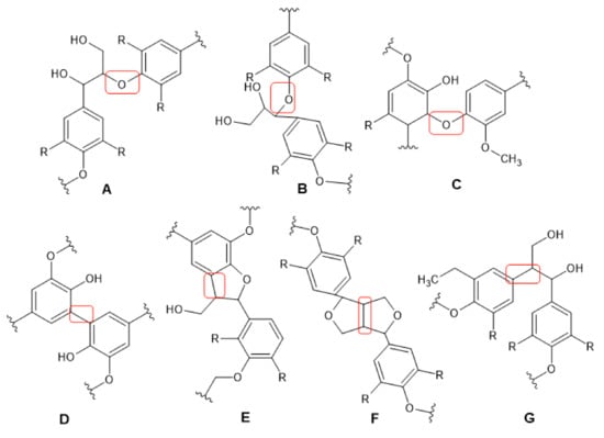 Chemical bonds found in lignin, comprised of both ether and carbon–carbon bonds (highlighted in red). (A) β-O-4, (B) α-O-4, (C) 4-O-5, (D) 5-5, (E) β-5, (F) β-β, (G) β-1.
