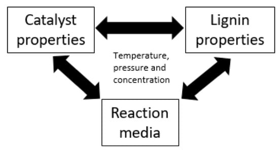 Together, these interactions, mediated by the temperature, pressure and concentration of the reactants, present determine the yield and the quality of the obtained bio-oil. Most studies published to date have focused exclusively on one of these interactions, while neglecting the others, trying to find the “best” catalyst or the “optimal” reaction conditions for a given reaction media or lignin type. While satisfactory results may be possible by following this approach, it is reasonable to believe that by achieving deeper understanding of all the interactions that take place simultaneously during the process, we can aim to achieve not only high yields and good quality of bio-oil, but also to do so economically and at industrial scale.