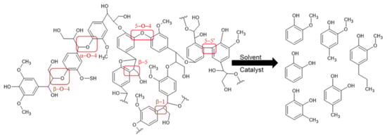 Diverse lignin depolymerization methods exist, such as pyrolysis, solvolysis and gasification []. Among these, pyrolysis tends to result in higher rates of char formation and higher oxygen content in the resulting bio-oil, whereas gasification allows high and fast conversion at the expense of char formation and products of lower economic value. Solvolysis, by using either a pure solvent or with a solvent mixture, results in minimal char formation and tends to favor the formation of low-oxygen-containing aromatic monomers []. These depolymerization methods, along with their reaction temperature and products, are briefly summarized in Table 1. Early studies employing solvolysis to depolymerize lignin suffered from high reaction temperature, long reaction time or high hydrogen pressure []; however, catalyst development and better understanding of the process have led to the development of less severe processes.