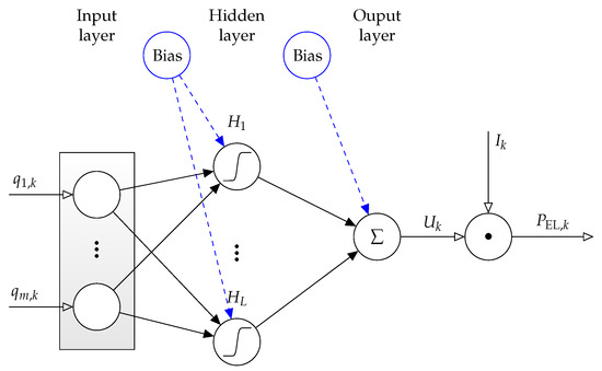 Static neural network model for the electric power characteristic of the SOFC stack with the network inputs , , , , , , and the output .