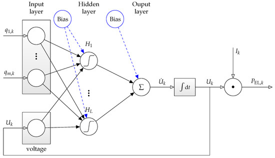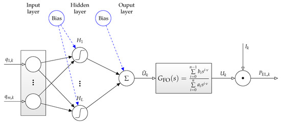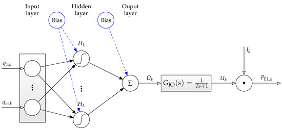 An extension of the static neural network system model described in the Section 2.1 is given in Figure 5. It is obtained by training the relationship between the input vector (second row of Table 2) which has been augmented by the stack voltage as a further input variable. In this model, the time derivative is treated as the neural network output. As described in detail in [33], the inputs and the output of this neural network need to be low-pass filtered with identical time constants so that no undesired phase shifts occur. Moreover, the variable is obtained—for the network’s training phase—by a numerical derivative approximation after the aforementioned filtering.