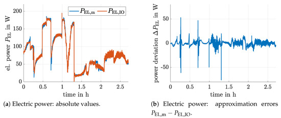 According to Figure 2, the neural network (where the number of hidden layer neurons with hyperbolic tangent activation functions was reduced from an initially overparameterized model with to , by using the principal component analysis from Section 2.2.2) produces the stack voltage , sampled at the same time instants k for which the vector of input data is given. A multiplication of the network output with the terminal current of the SOFC stack then provides the corresponding power . If the layer weights and bias variables which are highlighted by the filled arrow heads in Figure 2 are optimized in Matlab by means of the standard Bayesian regularization back-propagation algorithm (parallelized on four CPU cores) with a maximum number of 5000 epochs, in which a worsening of the validation performance was allowed in 50 subsequent iterations, the model accuracy according to Figure 3 is obtained. From the depicted horizon of data, a random subdivision into training (70%), test (15%), and validation (15%) data was performed as described in [33]. Note, the data in the current paper does not only contain the measurements from [33] (the first approx. 1.5 hours of the depicted values in Figure 3) but further experiments in which the hydrogen mass flow was adapted for a constant electric current with variable power. These data were acquired in the experiments published in [13].